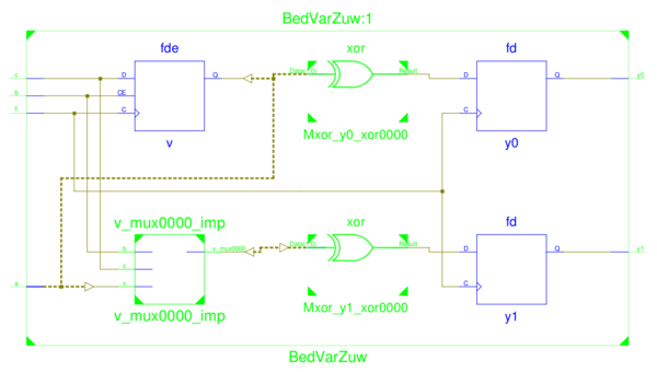 Die interne Variable, der nur bedingt ein Wert zugewiesen wird, und die beiden Ausgabesignale werden durch Register nachgebildet. Das Register für y0 übernimmt die EXOR-Verknüpfung des gespeicherten Variablenwertes. Die Schaltung zur Bildung des Eingabesignals für das Register von y1 besteht aus einem Multiplexer und einem EXOR-Gatter. Die Multiplexerschaltung gibt für b=0 den Bitvektor a&c und sonst den Bitvektor a&Q weiter.