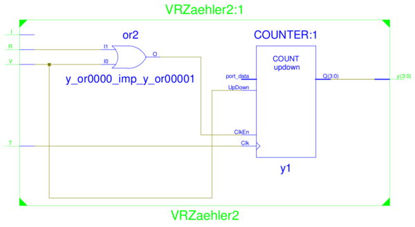 Die Synthese findet genau wie bei dem Vorwärts-/Rückwärtszähler im Beispiel zuvor einen Zählerbaustein. Der einzige Unterschied zum Ergebnis für die funktionsgleiche Schaltung aus dem Beispiel zuvor ist, dass die ODER-Verknüpfung nicht durch ein UND-Gatter mit Eingabe- und Ausgabeinvertierung, sondern direkt durch ein ODER-Gatter nachgebildet wird.