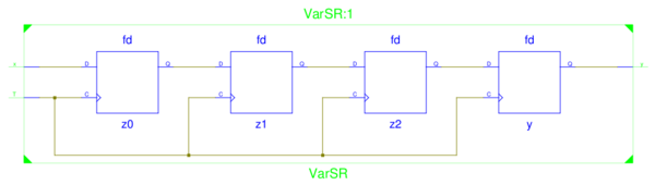 Die Beschreibung wir in ein 4-Bit-Schieberegister übersetzt.